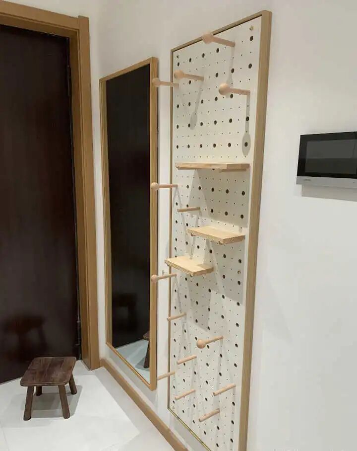 空间太小进门玄关没法做,但也不妨碍进门挂衣服包包。不得不说洞洞板是个好东西。