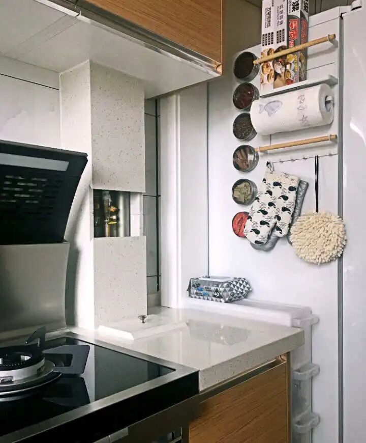 磁吸的置物架、调料盒、牙签盒、剪刀盒、开瓶器等等其实都可以安置在这里。台面上又可以干净一点了。