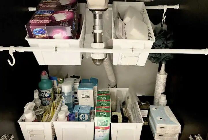 利用免打孔撑杆和挂钩这家的洗漱柜可算是物尽其用了!