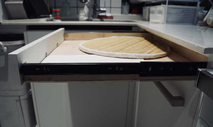 厨房台面下与储物中间10厘米的空隙做了超窄抽屉。装馍盘无敌好使。