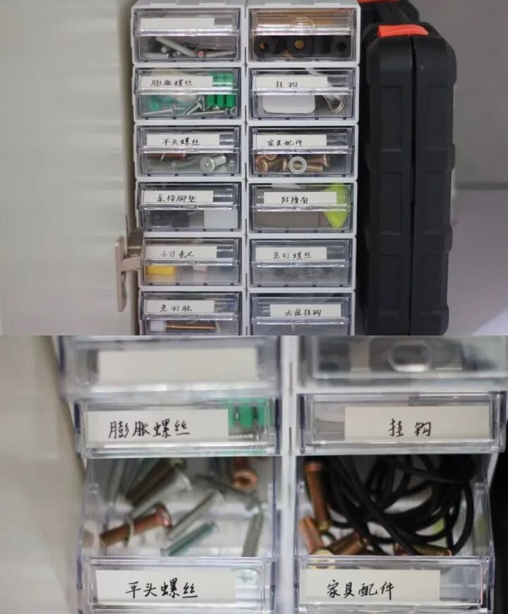 然后,对于装修剩下的各种大大小小的螺丝钉子、家具、电器的原装配件,则可以用这种透明的抽屉式收纳盒进行归整,贴上标签后对里面的物件更是一清二楚。