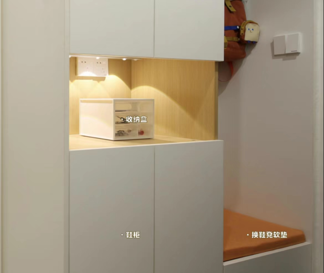 无论后期需要安装灯带、烘鞋机、智能鞋柜之类的都很方便,鞋柜上方预留插座,回家放下就能把智能手表、手机充上电,不必担心出门没电。
