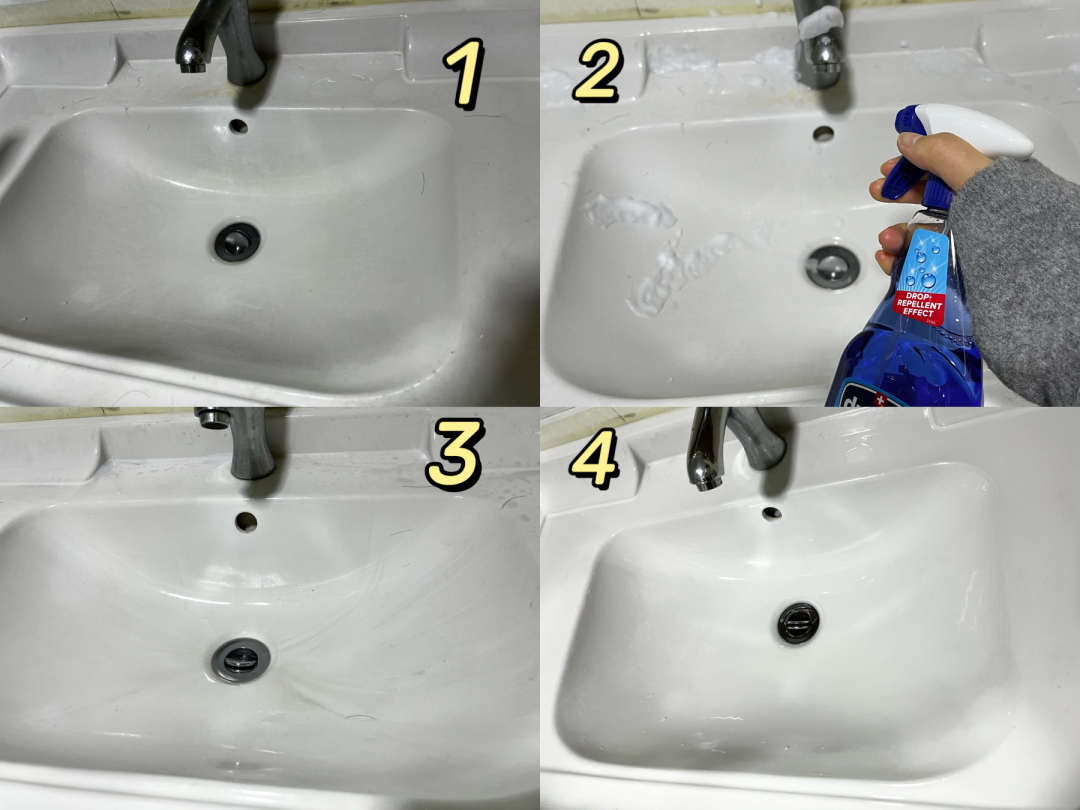 清洁洗漱池,喷上后30秒,肉眼可见污渍被分解后流下来,放上2分钟清水冲掉就干净如初了:
