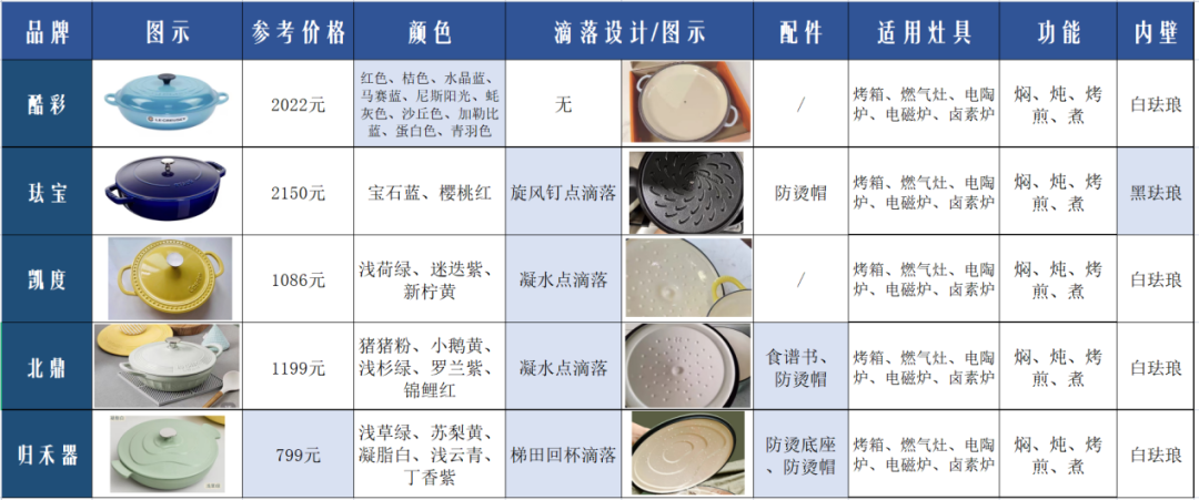 珐宝和酷彩则相对价格更高。珐宝颜色少,但是有大品牌背书,品质有保障,且锅的手感非常好,内壁黑珐琅是特点;酷彩颜色多且艳丽,颜值不在话下,但缺少凝水点,锅内水蒸气得不到有效回流容易煮溢。