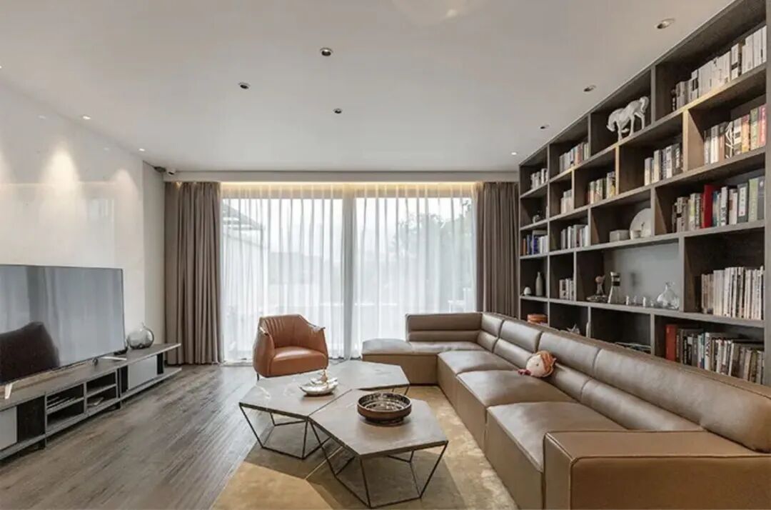 若确实想要一面书柜,强烈建议设计成带玻璃柜门的,收纳、放书、摆件等都更好用。