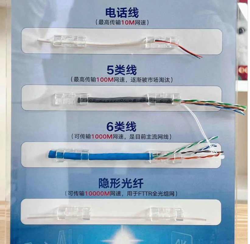 6类网线,标准的千兆网线,千兆网建议用6类线及以上线券隐形光纤,可传输10000M网速,屋内隐形布线,可实现全屋千兆覆盖。