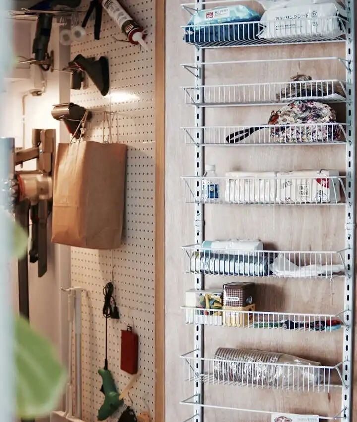 这面洞洞板墙和一整面门后挂篮真是打开了我对家务收纳能力的想象空间。