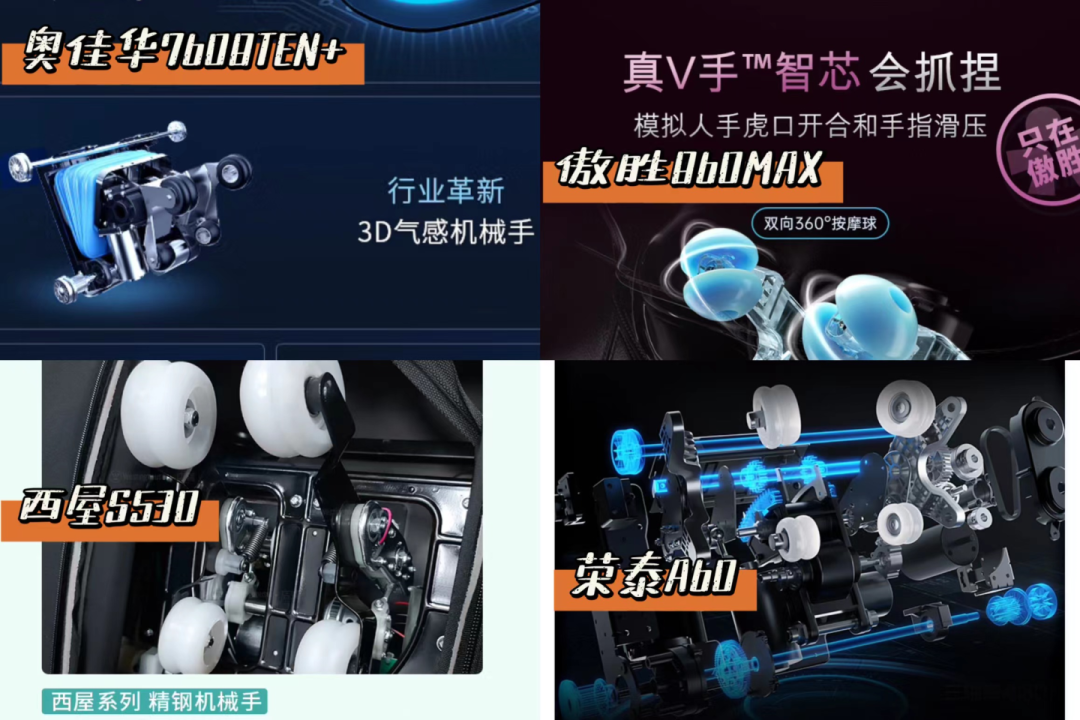 奥佳华7608TEN+、西屋S530都是精钢机械手,耐磨性、稳固性更强。奥佳华7608TEN+的机芯是3D气感机芯,4层气囊进行弹性调节,家里不同受力人群都可使用。