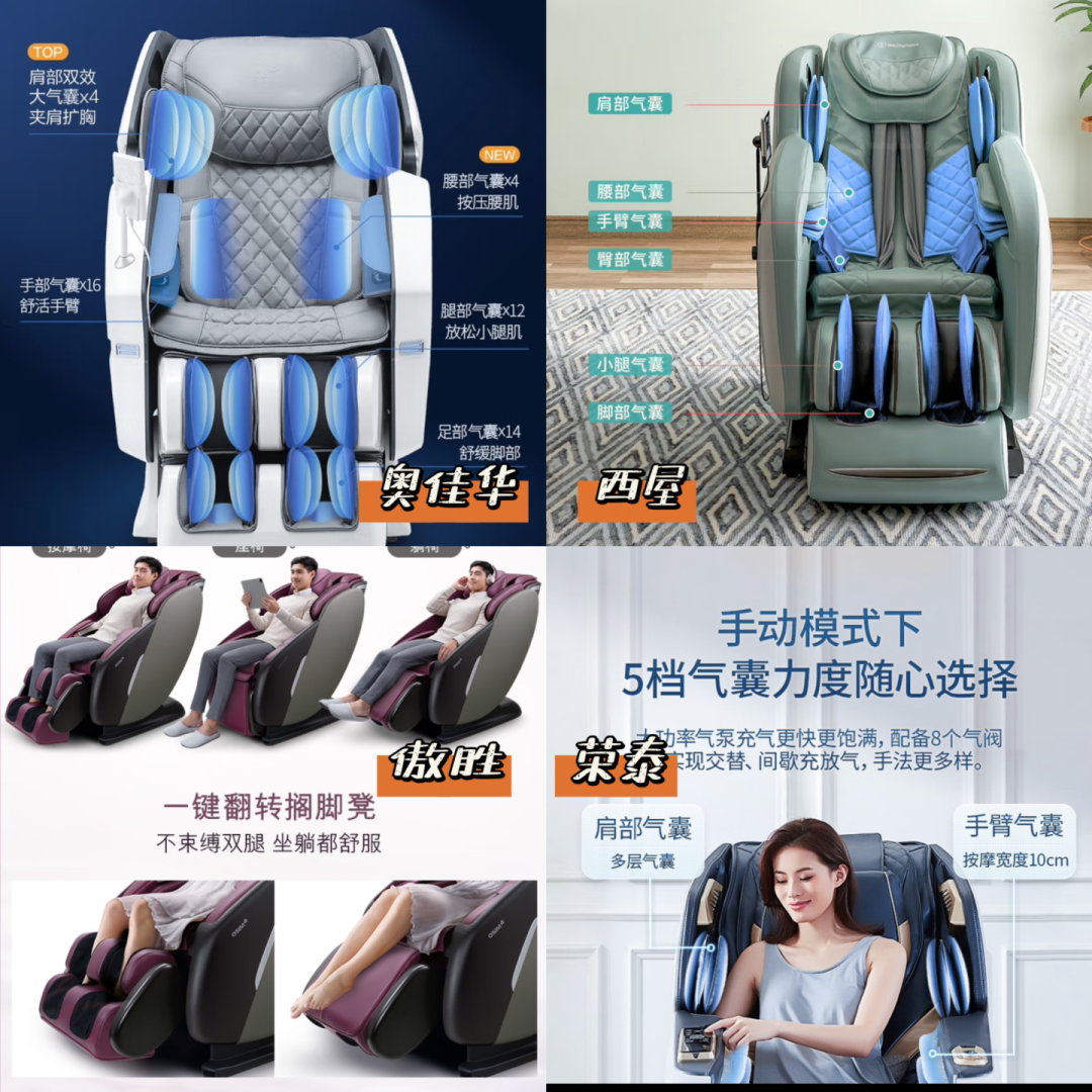 奥佳华7608TEN+、西屋S530的气囊明显比另两款更多,但气囊不是越多越好,分布合理最为重要。所以个人需求,2款的数据都不错。