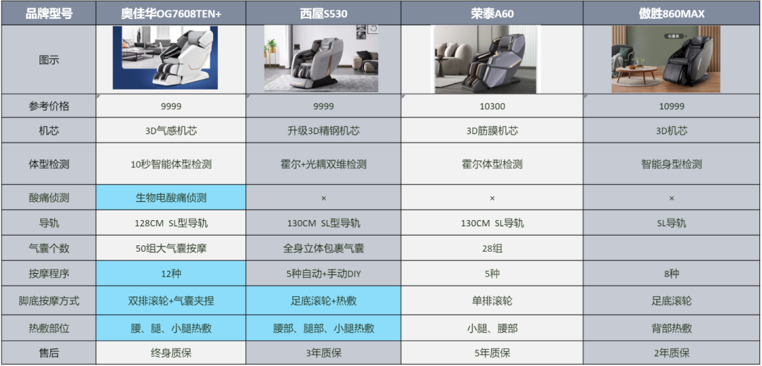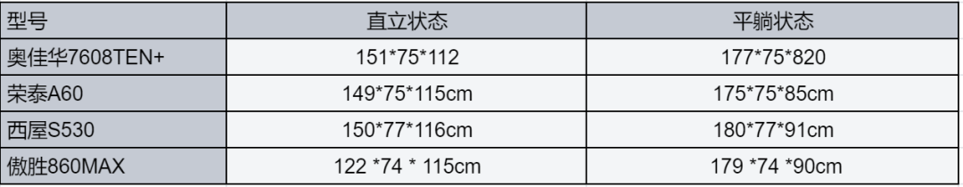 通过表格对比,很直观的能感受到奥佳华7608TEN+、西屋S530在长、宽、高度的数据上比另外两款都更优秀。