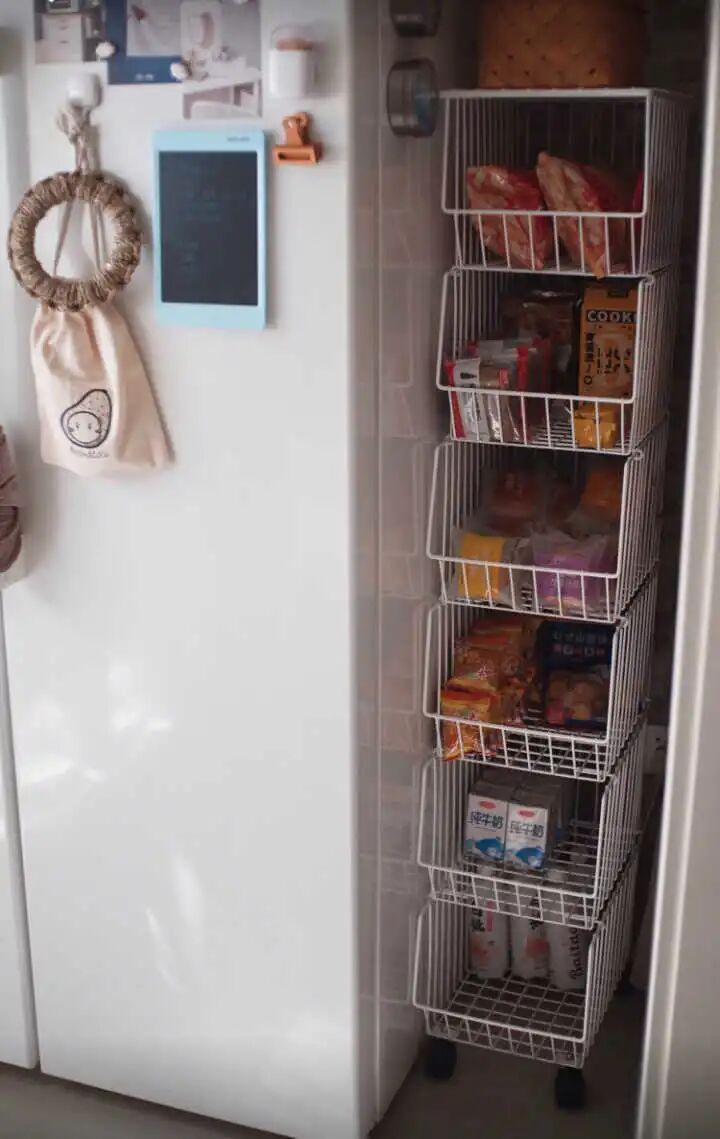 这里屋主的小心思也体现了出来:可移动小推车、免打孔撑杆等将这里每一寸空间都划分掉了!一点没浪费!