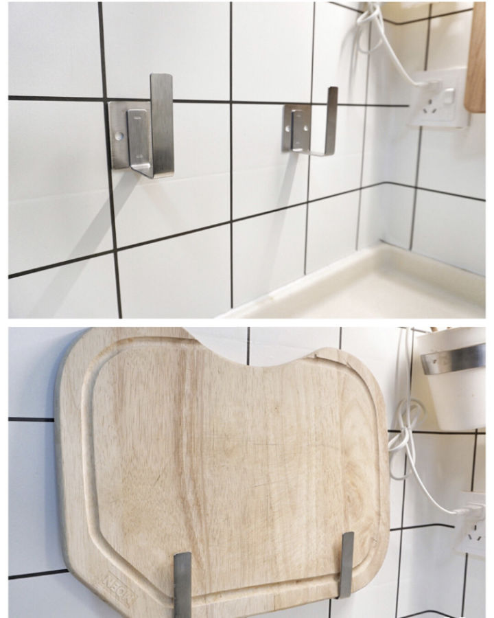 我家用这种免打孔的砧板收纳架,确定好距离和位置粘牢就行。之后这两大件就能直接上墙了~占空间什么?不存在的!