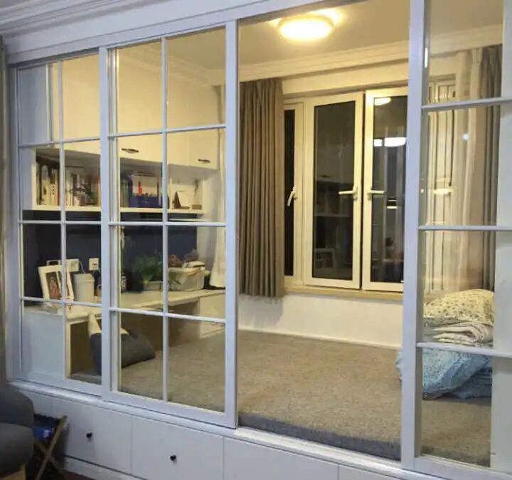 更有小户型空间利用典范,硬是牺牲了阳台在厅里创造出一个独立空间来。一边是开放式书架和书桌,一边是衣柜。装了移门和窗帘,一关上就是一个宁静的小宇宙