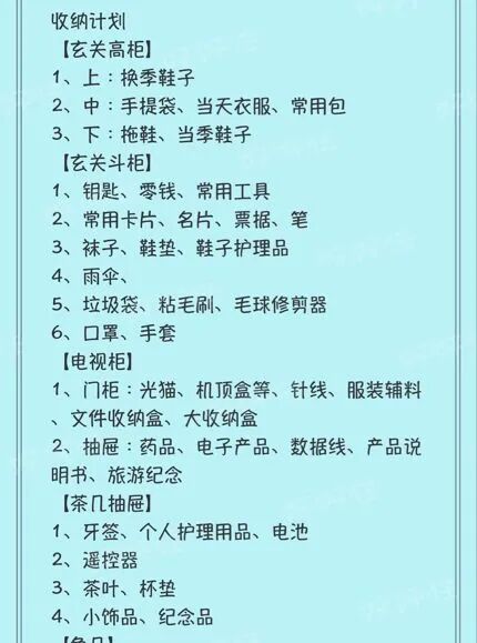 3.早早把新家收纳布局做好,具体到每个柜门里放哪类物品,也可以根据收纳布局表单来编号,搬入新家后的整理效率会大大提高!