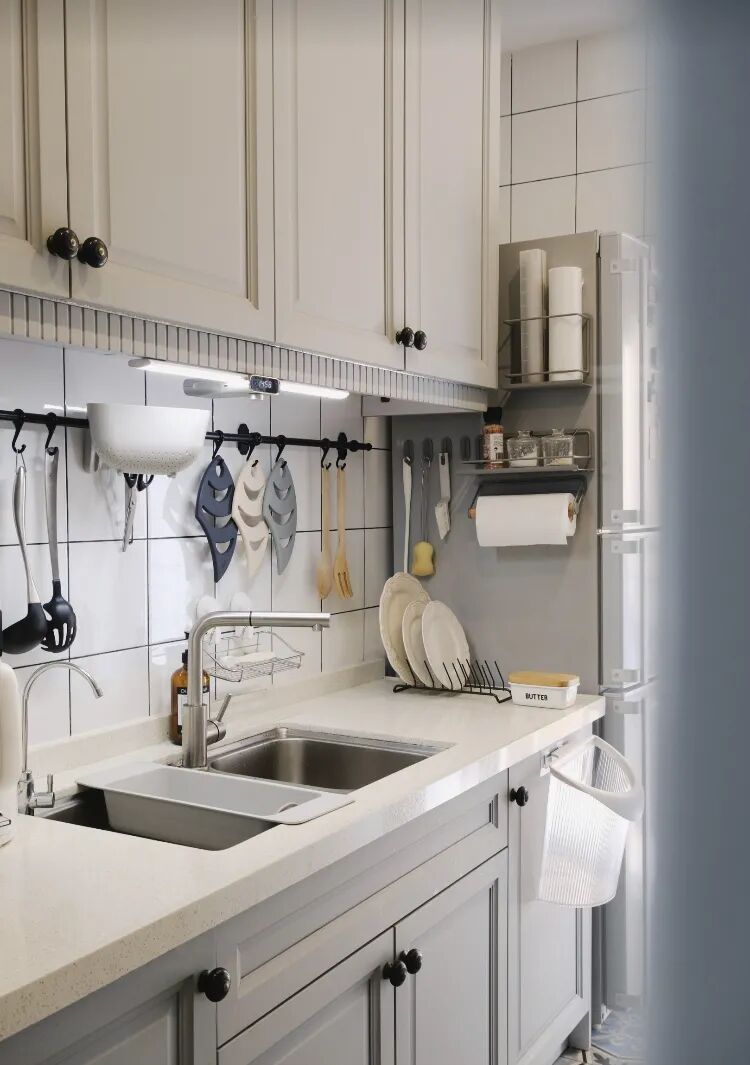 1、吊柜木门:不常用餐具、烘焙用品、外带餐盒、塑料餐具、