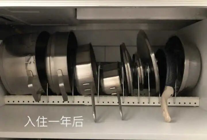 举个例子,有网友刚入住的时候对自家的不锈钢几件套做了收纳拍照: