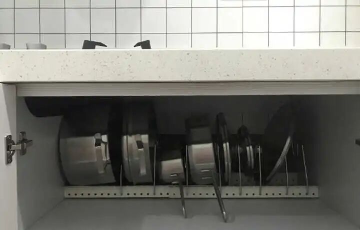304不锈钢隔断,喷塑底座,隔断位置可调节。亲测炒锅、平底锅、煮锅、锅盖、大餐盘、沙拉碗、烤盘都可收纳!隔断不够用的话可单独购买。