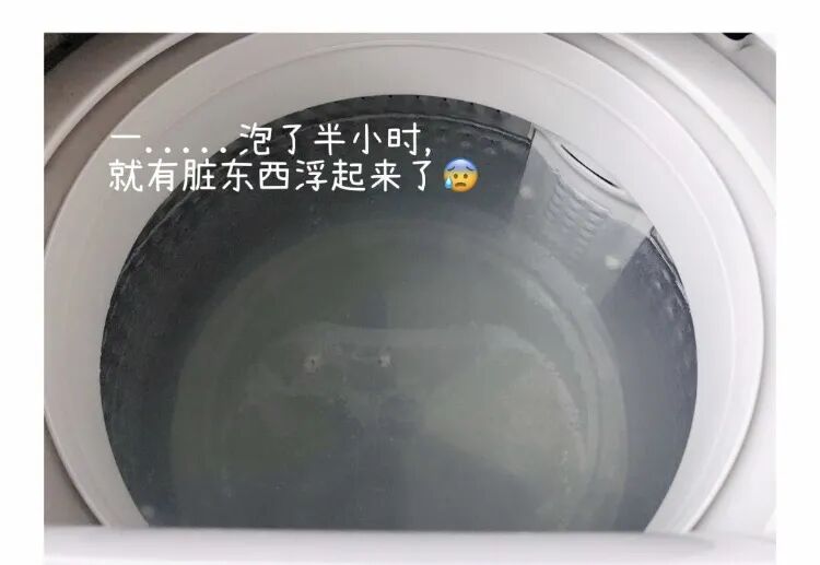 把清洁剂倒入洗衣机,加水浸泡,30分钟之后就会出现有脏东西浮出水面,
