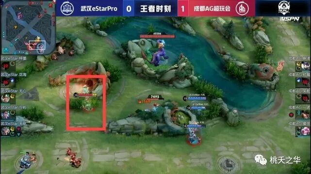 在一诺与瑶姗姗来迟的时候,eStar已经从下路迂回撤退,而一诺在利用假视野骗过eStar之后,蹲在了红buff的草丛,直接包抄对方三人。