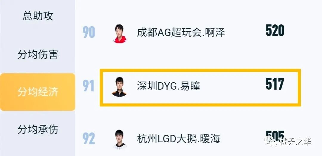 在选手的分均经济排行榜上,易瞳排在91位,整个KPL联赛有120多位选手,排在易瞳后面的30位选手,全部都是辅助位。