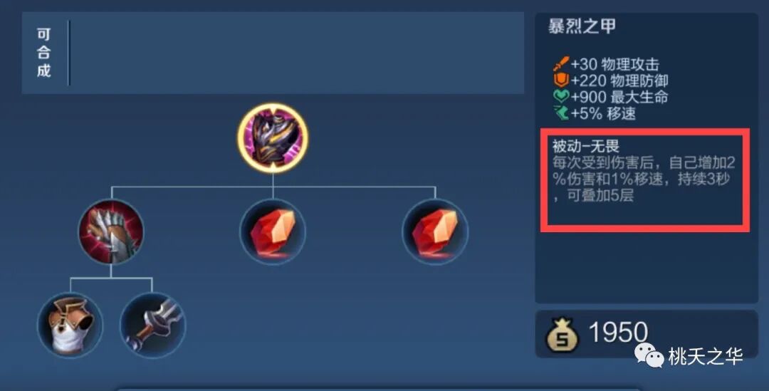 暴烈之甲,拥有移动速度、物理攻击、最大生命值、物理防御属性,被动还可以增加伤害,这件装备或许会成为战士、刺客类英雄的不错选择,并且与反伤刺甲一样,合成小件中包括荆棘护手,并不会担心前期的抗压能力。