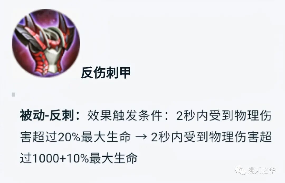 也就是说坦克英雄在这个赛季还是可以装备反伤刺甲,但是战刺英雄装备反伤刺甲的收益明显降低了。
