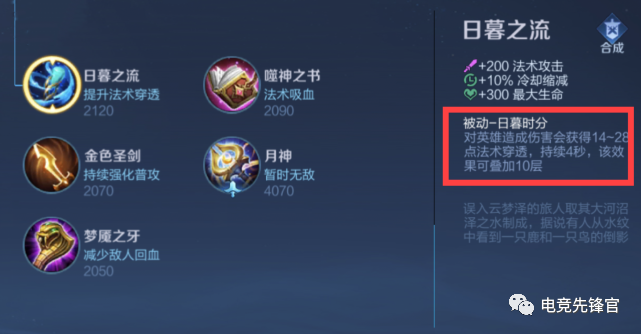 第四件装备选择日暮之流,拥有法术攻击、冷却缩减、最大生命值,最主要的就是被动穿透效果,扁鹊由于毒伤害属于持续伤害,可以短时间内就可以把日暮之流的被动叠加到十层效果。