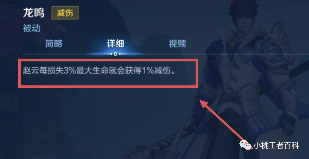 赵云的被动免伤是,每损失百分之3生命值,可以获得百分之1免伤,大约就是百分之90生命值,免伤百分之3,百分之80生命值,免伤百分之6,以此类推为百分之10生命值,免伤率大约为百分之30,最高免伤约为百分之33.3,由此可见,半血的赵云,免伤性价比是最高的。
