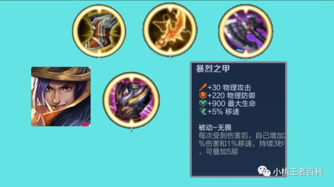 第五件装备,选择暴烈之甲,在这个时间段,对方的C位输出已经成型,此时的刘备应该增加生存能力,才能让三技能的护盾更具有性价比,暴烈之甲有物理防御,有生命加成,更重要的是拥有移动速度加成,被动的伤害以及移速加成,刘备也很容易触发。