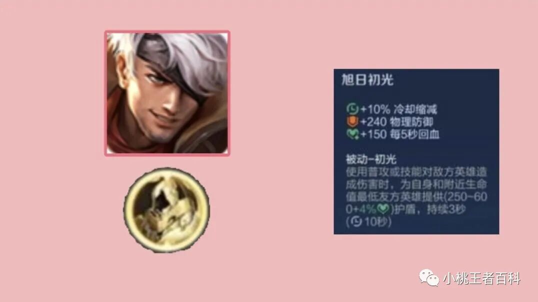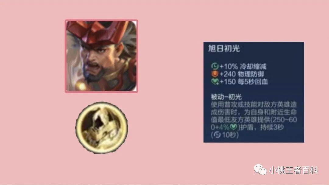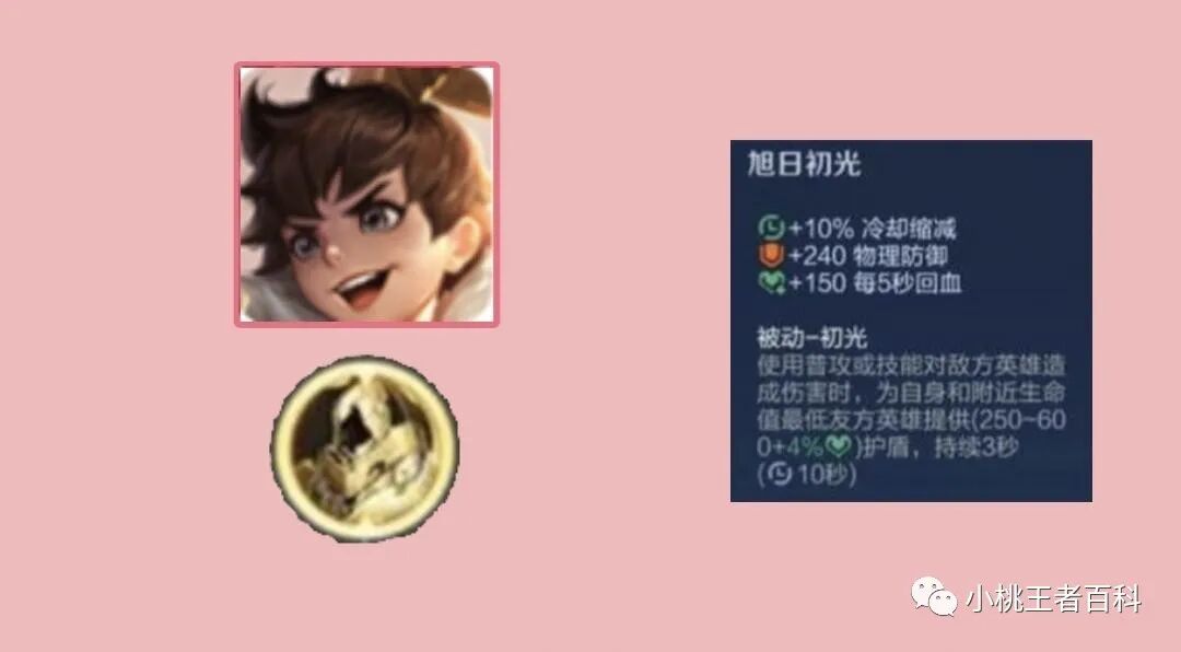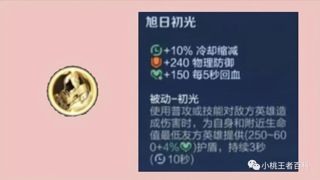 所以旭日初光的团队增益并没有想象的强大,但是我们也并不能全盘否认这件装备,基础属性与装备英雄的护盾效果,还是非常不错的,百分之10冷却缩减,240物理防御,150点每秒回复,以及最大生命挂钩的护盾,非常适合拥有护盾技能的坦克英雄装备。