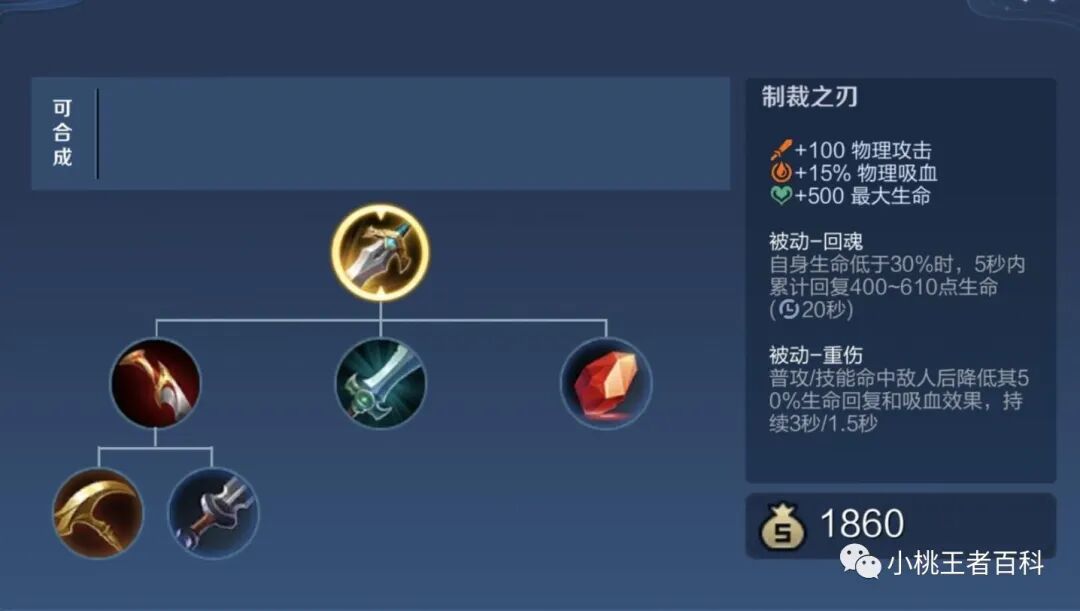 制裁之刃的价格为1860金币,属于最低一档价格的装备,合成途径也非常平滑,如此低廉的价格,换来百分之50的重伤效果,从性价比这方面来说,确实非常不错。