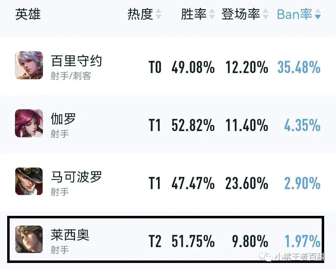 莱西奥在上线之后,一直是射手阵型的佼佼者,与戈娅并列为发育路双雄,在戈娅削弱之后,莱西奥更是成为了射手中的唯一T0射手,不管是出场率还是胜率,都排在射手榜前列。
