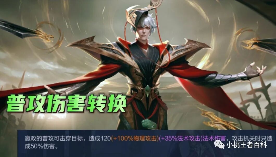 嬴政的普攻伤害转换,与芈月的类似,也是在物理攻击百分百转换的基础之上,又增加了基础+法术百分比伤害,甚至还增加了一个穿透效果,可以造成范围伤害。