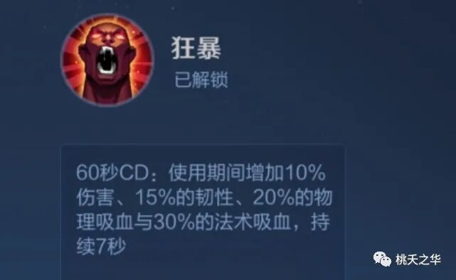 当然有,在召唤师技能中有一个技能狂暴,增加百分之十伤害,百分之15韧性,百分之20的物理吸血与百分之30法术吸血,持续7秒,而且CD只有60秒。