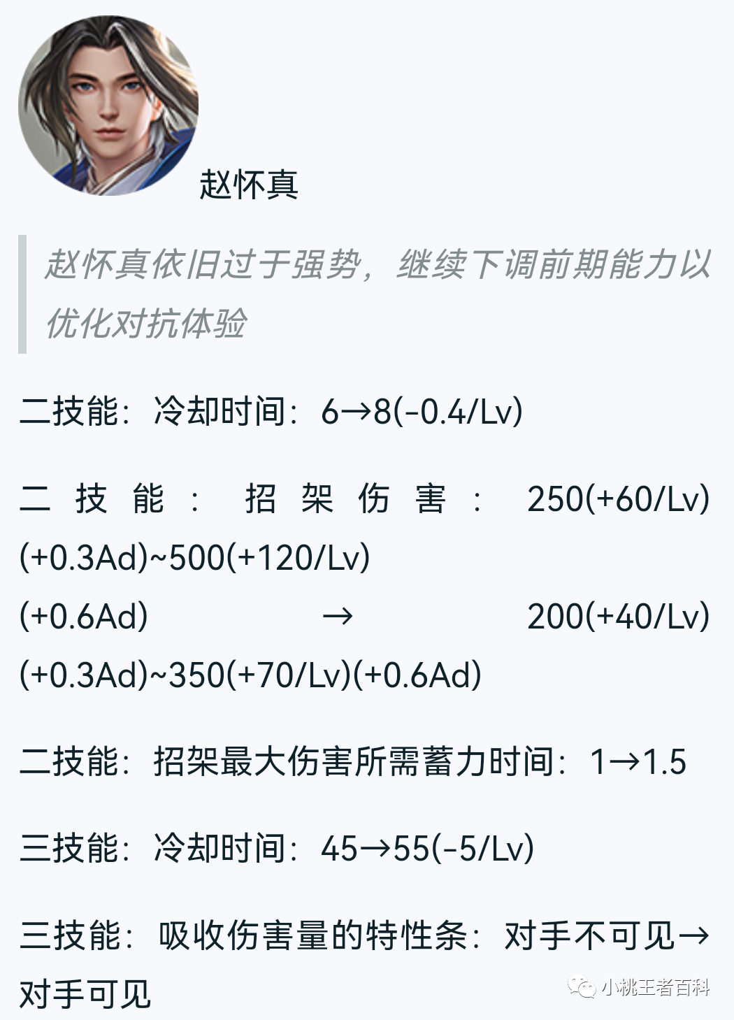如今被动普攻伤害降低,让赵怀真的输出能力降低,二技能的最大蓄力增加,让赵怀真的承伤能力降低,二三技能的CD增加,让赵怀真的功能性降低,现在的赵怀真,在选择装备上,只能选择一个定位。