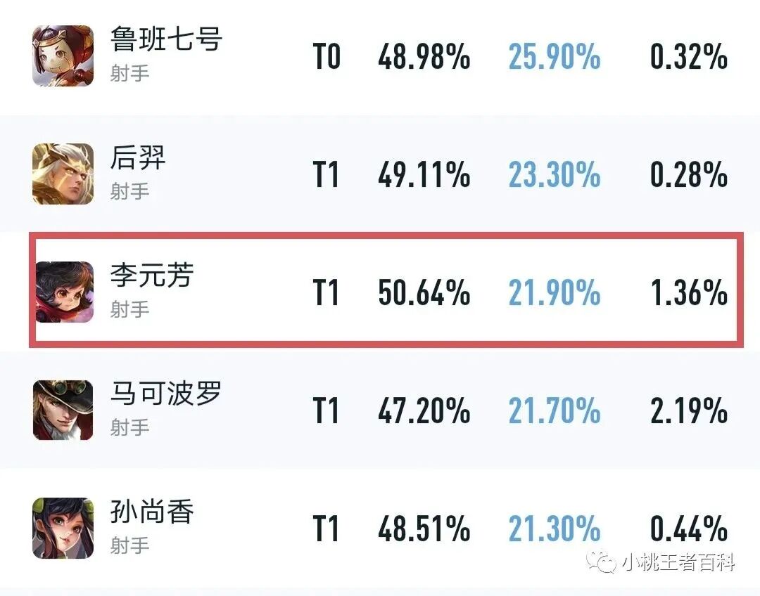 在全分段发育路排行榜中,出场率位居前列的射手,只有李元芳的胜率超过了百分之50,这就足以说明了李元芳的强度。
