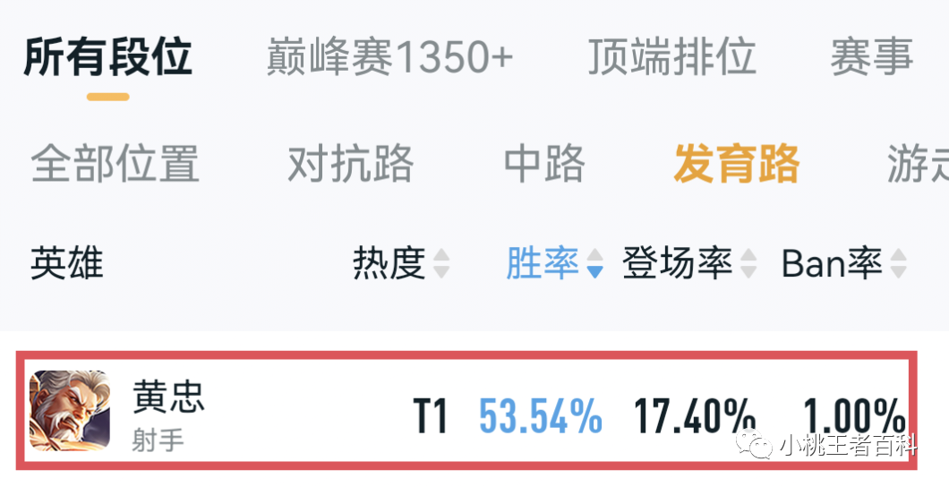像是鲁班七号,伽罗,黄忠,相较于前几个赛季,胜率以及出场率都有了明显提升,尤其是黄忠,更是以百分之17.4的高出场率,排名胜率第一,俨然已经成为了射手一哥。
