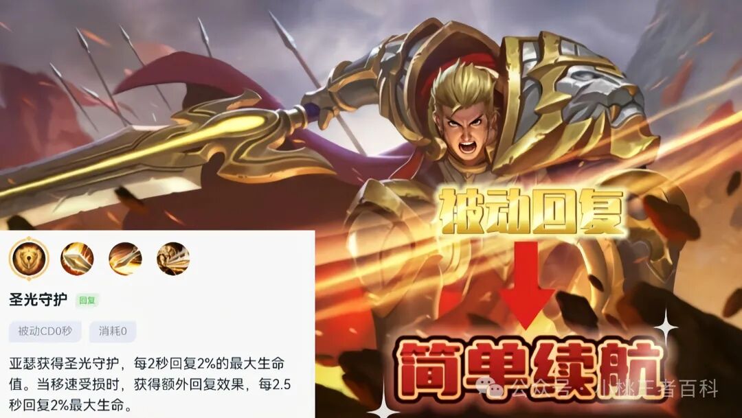 首先来说亚瑟本身的技能机制,亚瑟的被动可以回复生命值,但是两秒才能回复一次,效果非常差。如果按照后期成型来计算,两秒大概回复200左右生命值,作为脱战后的续航可能足以应对,但是在团战中,这点回复根本起不到关键作用。
