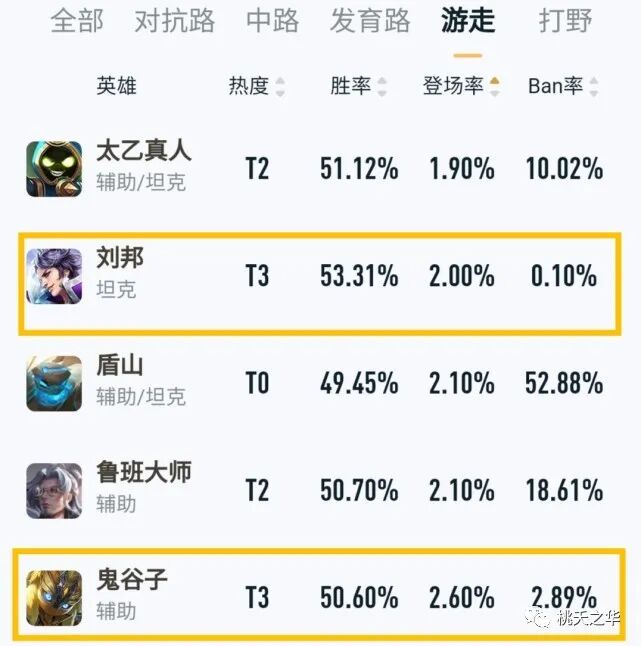 而且从游走位的数据榜单中,我们可以发现,辅助英雄的平均出场率非常高,大约在百分之十左右,而且这还是因为有几位辅助英雄由于BAN率太高,所以限制了出场率。