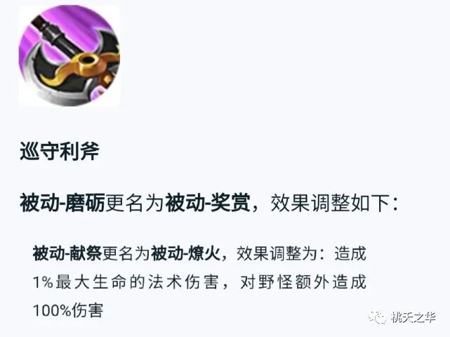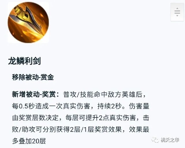 被动的累积赏金移除,改为了击杀野怪额外获得,被动的真实伤害与助攻与击杀助攻挂钩,这让边路惩击直接强度折半,毕竟边路惩击击杀野怪的数量屈指可数,而且黄刀惩击边路的强势就是单带牵制,助攻与击杀一般都比较少,那黄色打野刀的真实伤害就会缺失,黄刀边惩流彻底沦为了历史。