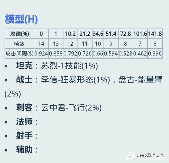 模型H的攻速档位只有九个档位,每个档位的攻速阈值如下: