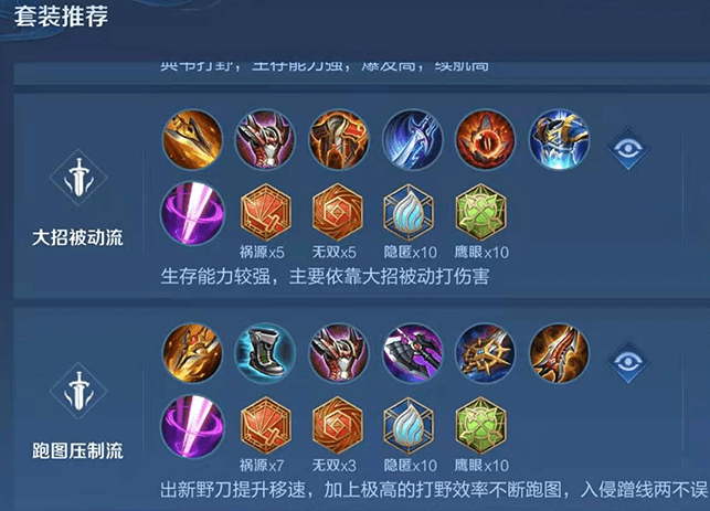 出装方面肉打野刀可以保证典韦一定的自身坦度,毕竟还是要以半肉出装为主,输出有暗影战斧和宗师之力的加成即可,至于典韦的铭文当然是选择5祸源、5无双、10隐匿、10鹰眼,这套铭文让典韦在前中期刷野速度有所保障,暴击效果和物理穿透都是典韦输出能力的体现。