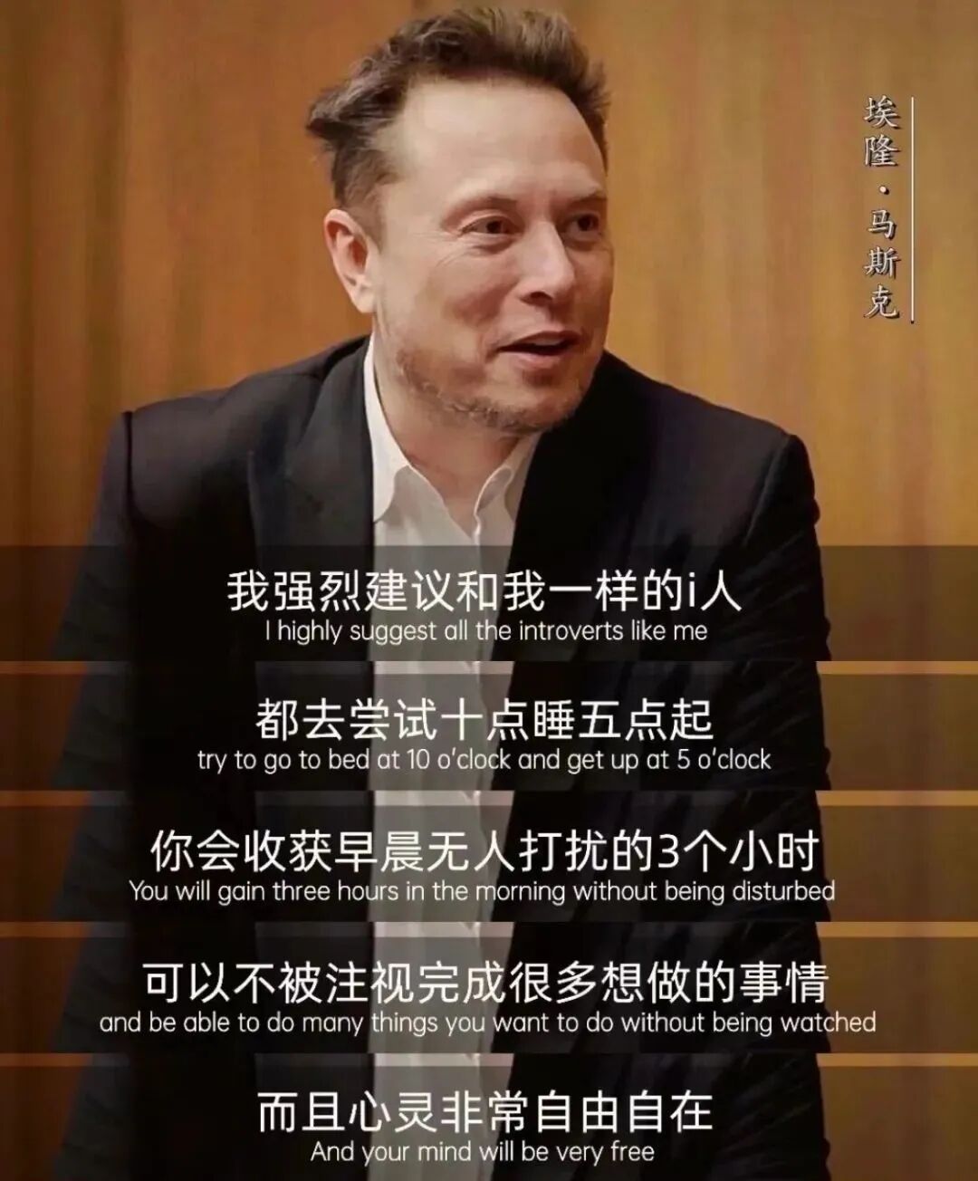 马斯克曾说:我强烈建议和我一样的i人,都去尝试十点睡五点起,你会收获早晨无人打扰的3个小时,可以不被注视完成很多想做的事情,而且心灵非常自由自在。