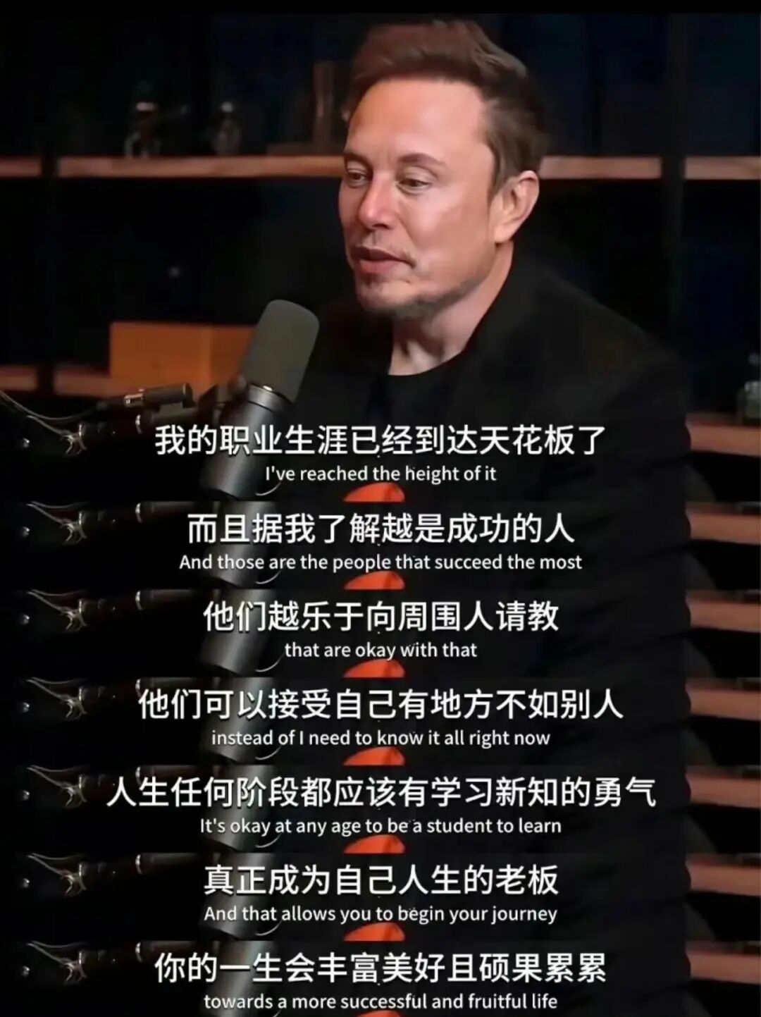 马斯克说:越是成功的人,他们越乐于向周围人请教,他们可以接受自己有地方不如别人,人生任何阶段都应该有学习新知的勇气,真正成为自己人生的老板,你的一生会丰富美好且硕果累累。