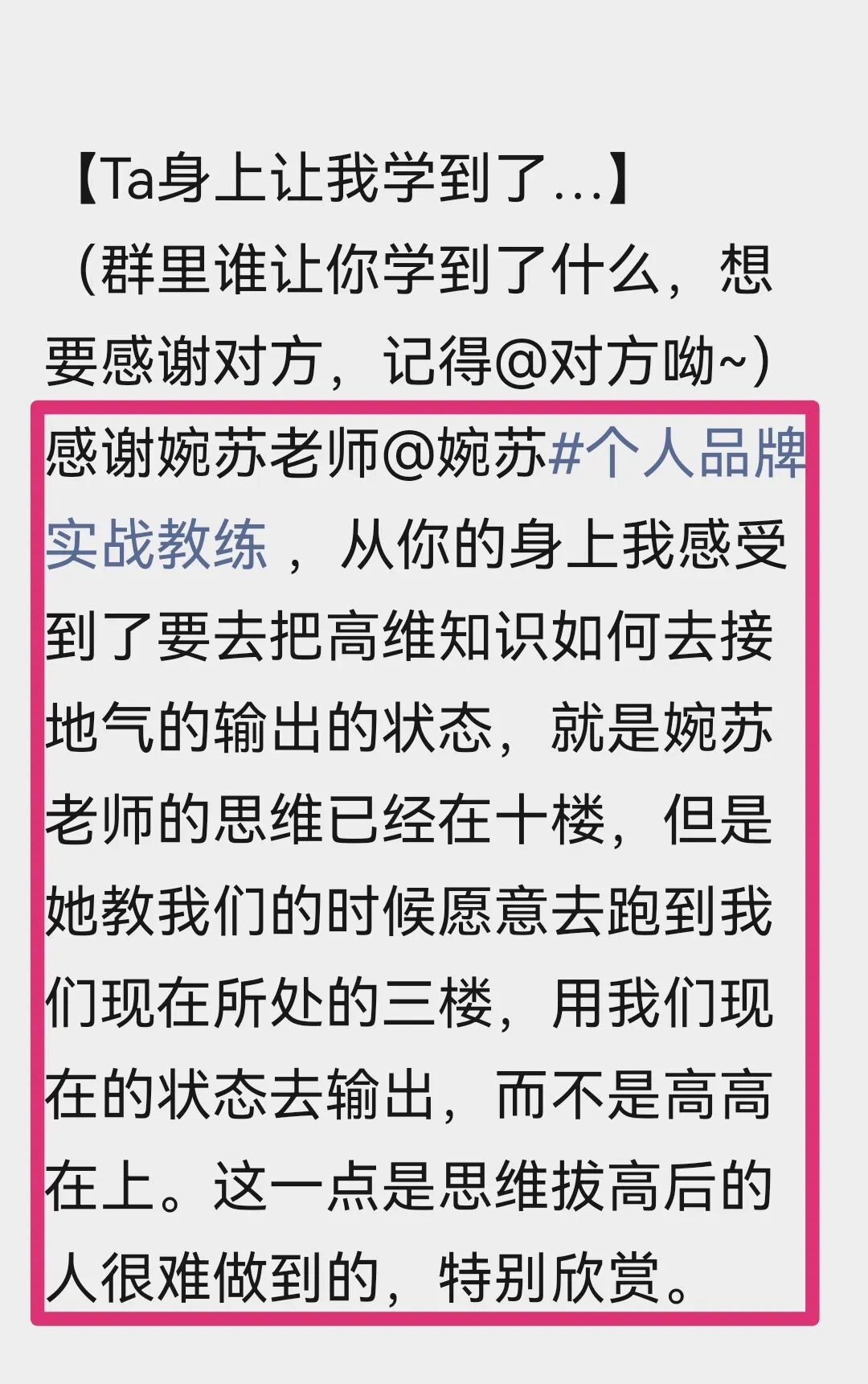 她说从我的身上感受到了要把高维知识如何去接地气的输出来,我的思维在十楼,但教大家的时候刻意去到三楼,这个比喻特别棒。
