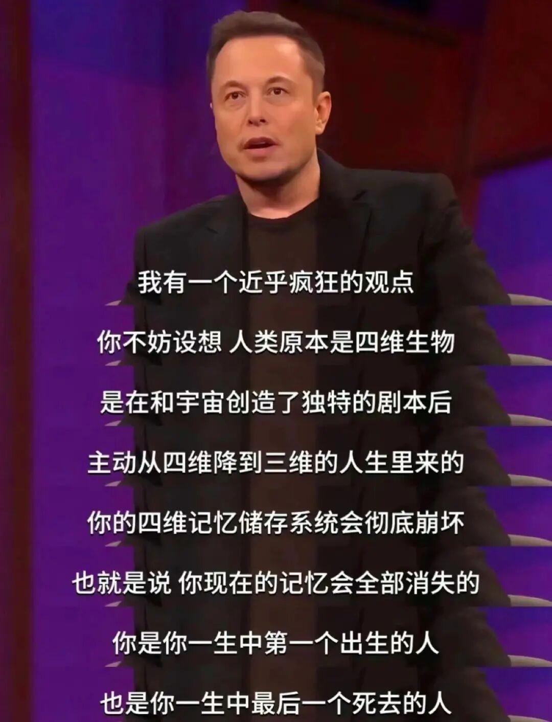 马斯克还说:我有一个近乎疯狂的观点,你不妨设想人类原本是四维生物,是在和宇宙创造了独特的剧本后,主动从四维降到三维的人生里来的,你的四维记忆储存系统会彻底崩坏。