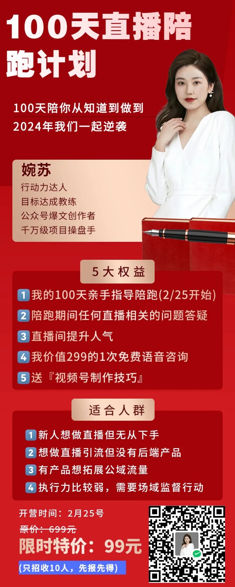 如果你担心做不好直播或者不知道怎么直播,赶紧来找我,我用100天陪跑你,而且只需要99,也就是1天1块,我一定会让你把直播和短视频这个事做起来并且做好。