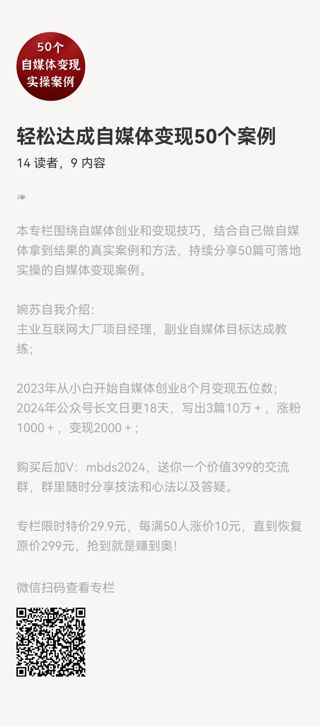 2024年,婉苏开通了小报童专栏,主要分享一些自己做自媒体拿到结果的真实案例和方法,把实操经验总结分享给你,可以直接复制实现变现。