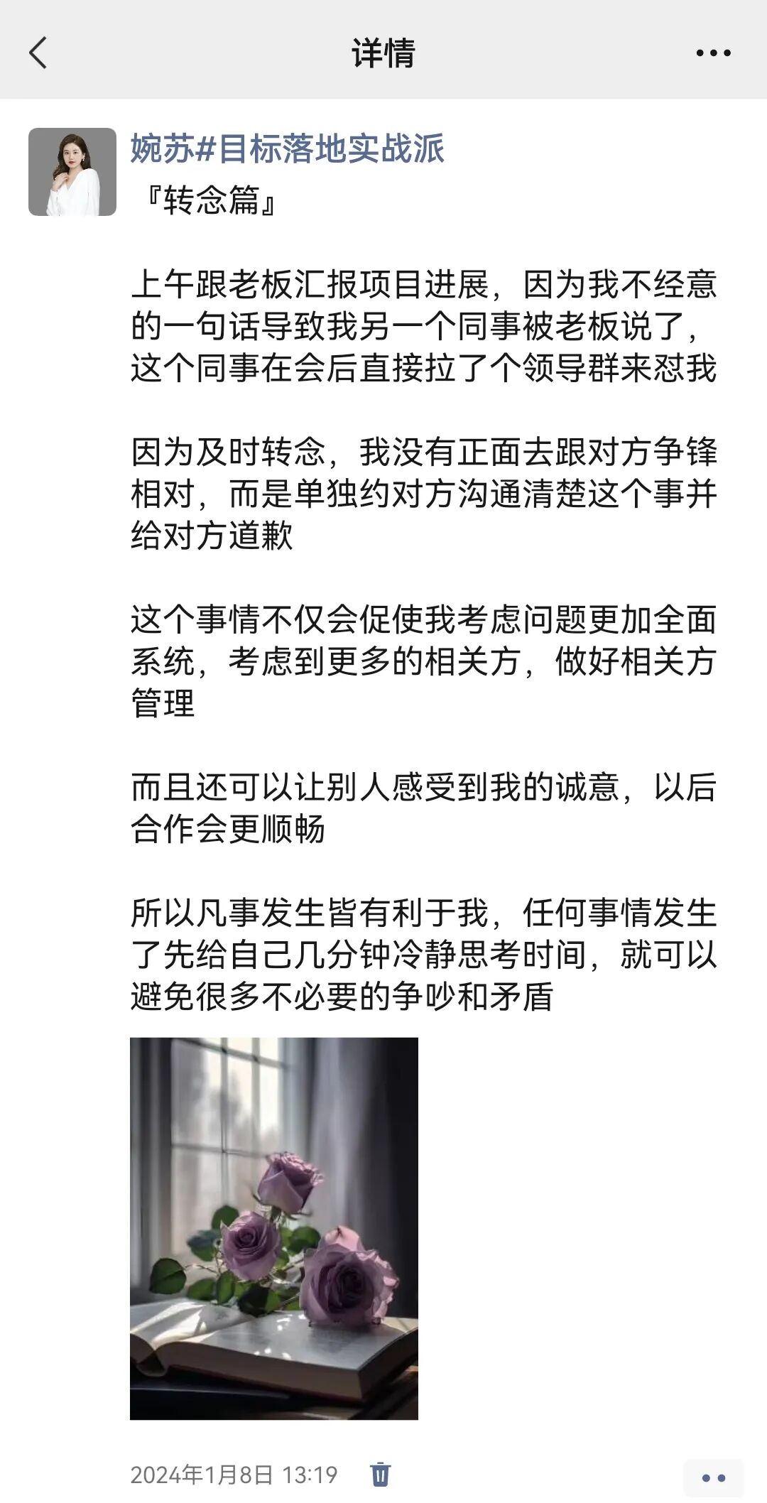 因为懂得转念,我一直觉得凡事发生皆有利于我,所以我都会思考这件事的发生是因为自己那些方面还需要提升,我还特意发了一条朋友圈。