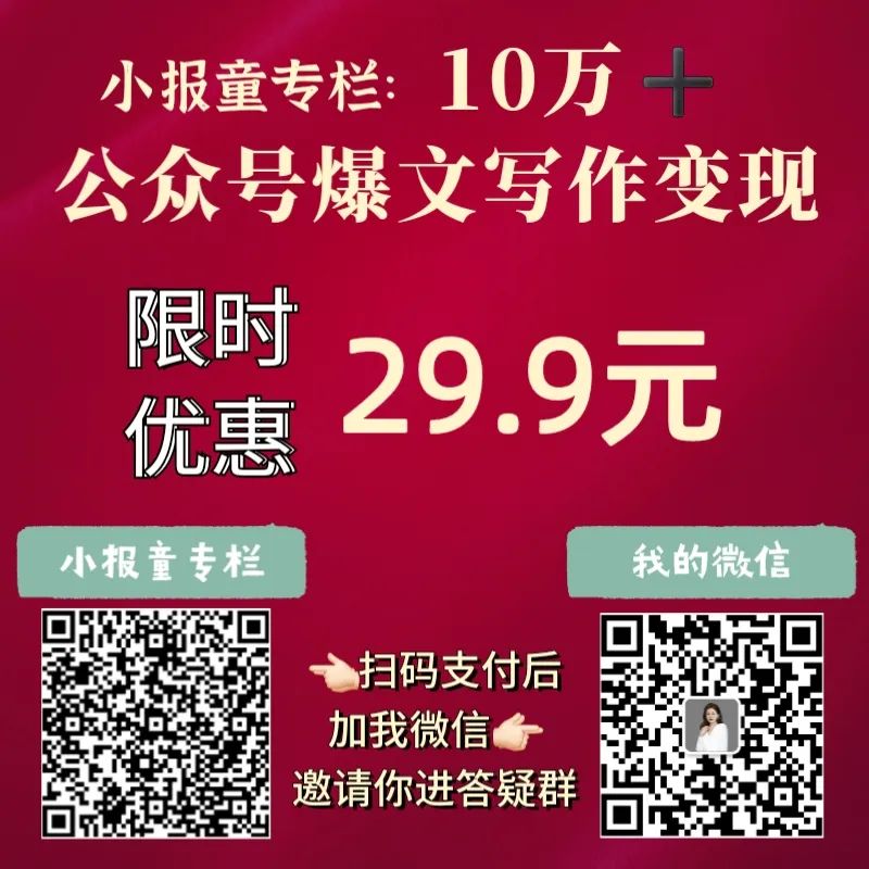 婉苏开通了小报童专栏,专栏是公众号爆文写作和变现课程,重在掌握爆文底层逻辑,顺势而为,顺便组建了一个爆文陪跑群,手把手教你写出爆文。
